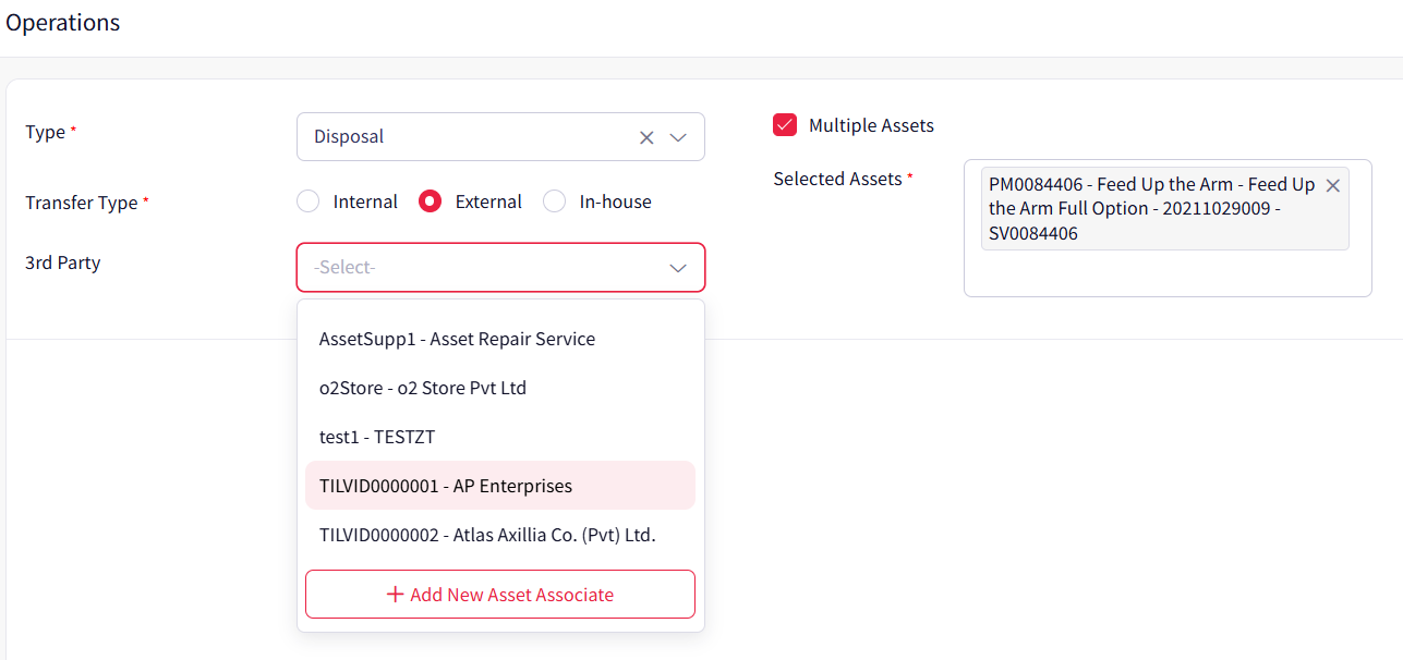 Step 5: Select the asset from the dropdown. If the operation involves more than one asset, tick the “Multiple Assets” checkbox.