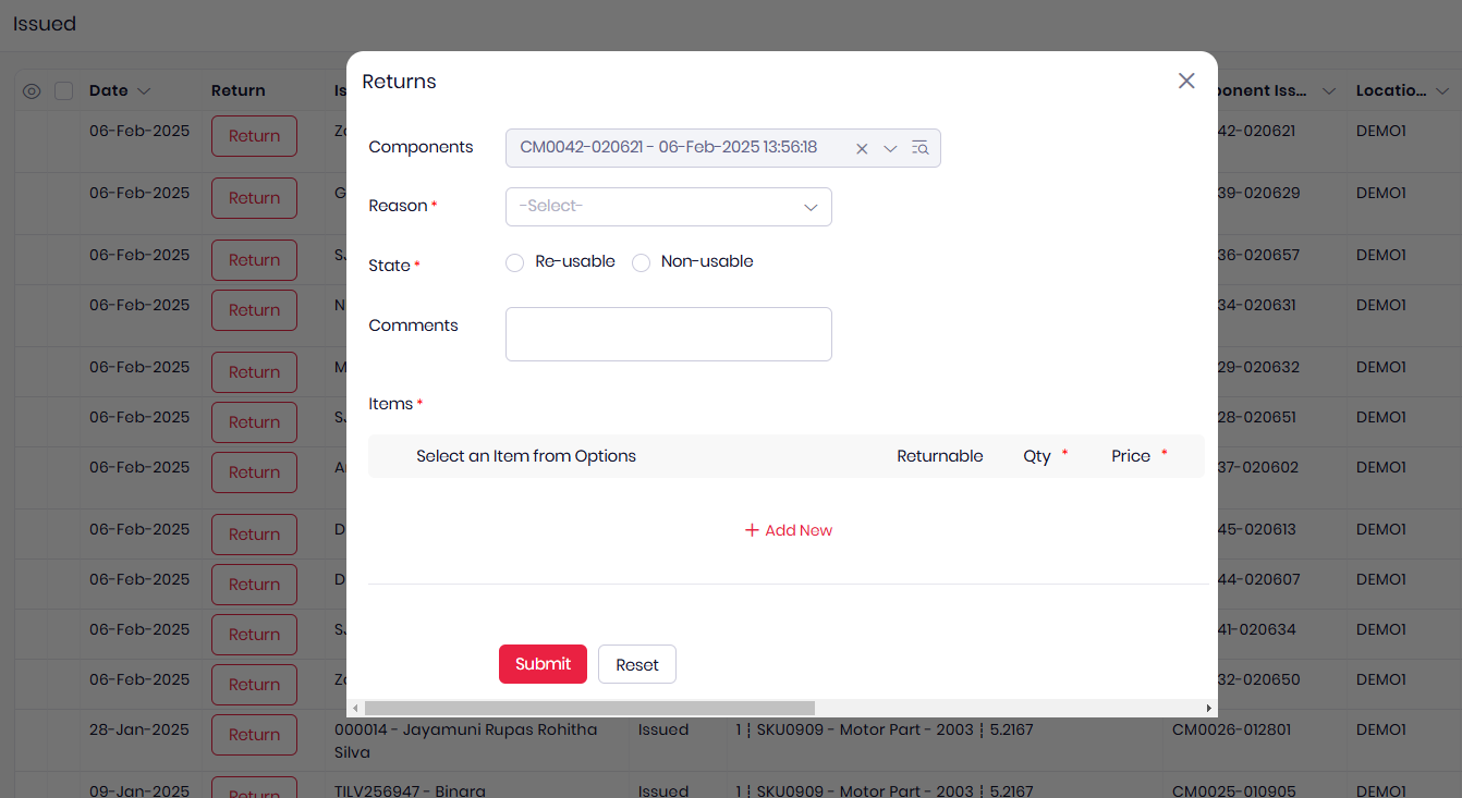 Step 3: In the next window, select the reason for returning the component from the dropdown menu.