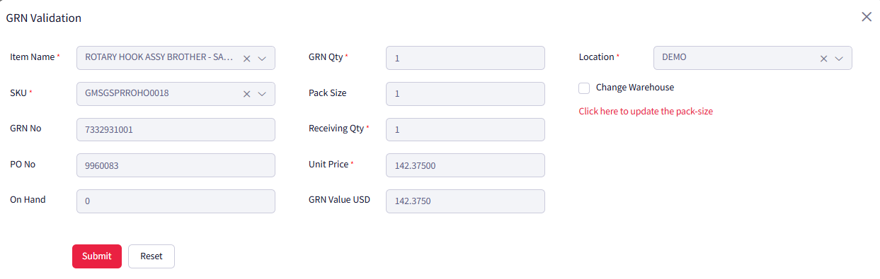- Change warehouse: Check this box if you want to GRN under your sub warehouses. From the dropdown that appears you can select your sub warehouse.