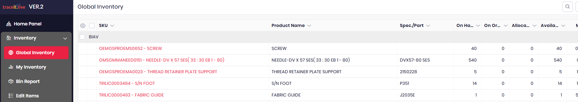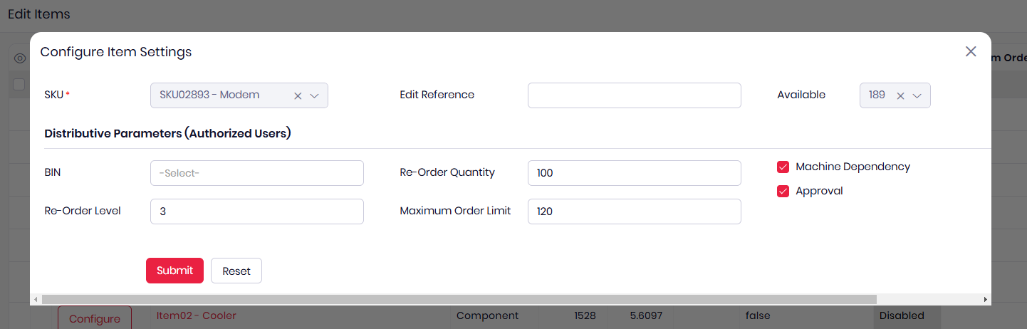 Allows configuration of item details, such as updating BIN numbers, re-order levels, and setting order limits for more precise inventory management.