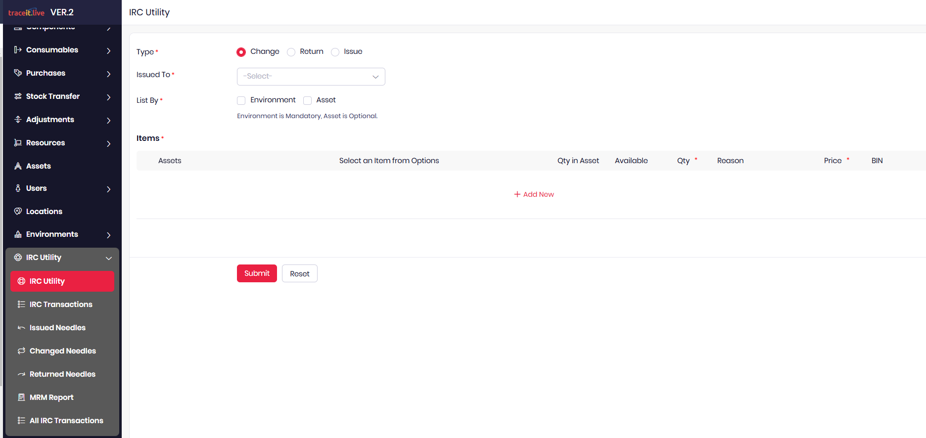 In Needle IRC Utility you can Change, Return and Issue under the same section. Follow the steps below to complete needle transactions. Each transaction must be submitted with accurate details for proper inventory tracking.